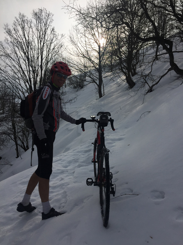 Der Tour begann mit einer Fahrt mit dem ICN nach Süden, Heini stieg in Arth Goldau zu. In Lugano begrüssten uns schon fast frühlingshafte Temperaturen und blauer Himmel. Mehr oder minder der Hauptstrasse entlang ging es nach Como, von wo aus wir dem Ostufer des Lago die Como folgten. Bei Nesso machten wir in einem Café noch eine Panini und Kuchen Pause um dann zur Colma di Sormano hinauf zu kurven. In Anbetracht der schon etwas fortgeschrittenen Zeit verzichteten wir dann auf den Pass zwischen Canzo und Valmadrera und fuhren, der Autobahn irgendwie ausweichend, unten herum nach Lecco. Dort suchten wir noch eine Pasticceria auf, um noch eine Focaccia zu organisieren. Frisch gestärkt fuhren wir dann auf der eher etwas befahrenen Strasse Richtung Balabio. Ab der Abzweigung nach Morterone war es dann sehr ruhig und wir konnten dem Sonnenuntergang zuschauen während wir hinauf fuhren. Das Dorf Morterone liegt auf der anderen Seite des Passes. Es war dann etwa am eindunkeln, als wir dort ankamen. Netterweise war die einzige Trattoria (Trattoria dei Cacciatori) im Dorf offen. Als Bonus waren die Besitzer auch bereit, uns ein Zimmer vorzubereiten (ging eine Weile). Es war nicht sonderlich warm, aber es gab eine Dusche mit warmem Wasser. Für das Abendessen war ein grosser Tisch vorbereitet, der dann auch bevölkert wurde. Wir bekamen auch je einen Teller Pizocceri ab. Nebenbei studierten wir noch die Optionen, die Strecke fortzusetzen, die asphaltierte Strasse endete definitiv in Morterone.