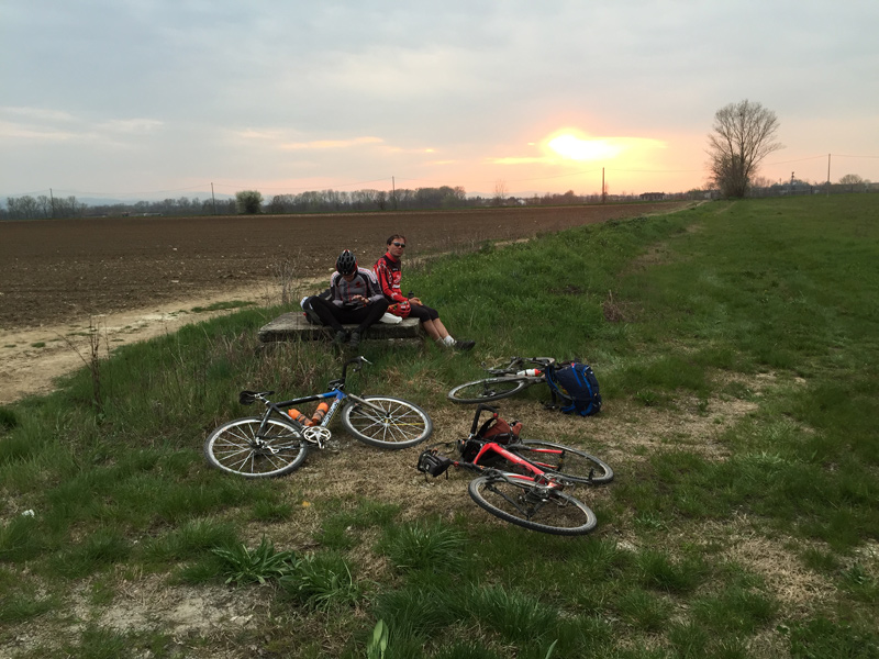 Bei Sonnenlicht präsentierte sich die Lage immer noch etwas problematisch. Der Pass, den wir queren wollten, war in Sichtweite, zeigte sich aber mit einer hübschen Schneedecke drauf. Soweit wir den Wirt verstanden, sollte eine Überquerung nicht unmöglich sein. So machten wir uns nach dem Frühstück auf den Weg in Richtung Passo del Palio (so um die 1362 m.ü.M.). Weit konnten wir nicht fahren, aber die Schneedecke war noch gut gefroren, so dass es gut zum Laufen ging. Auf der Südseite war der Schnee schon weg und wir konnten relativ viel der Strecke nach Fuipiano mit den Quervelos fahren. In Alme (Paladina) trafen wir Klemens, er war am morgen schon in Monza los gefahren. Von Nordwesten her kamen wir dann in der Altstadt von Bergamo, wo wir uns in einer der vielen Pasticcerias verpflegten. Dann ging es weiter Richtung Seriate/Flughafen. Ab dort fuhren wir dem Fiume Serio entlang. Der Weg war meistens ausgeschildert und recht gut mit dem Quervelo befahrbar. So kamen wir recht effizient voran, es gab nur einen Platten. In Crema machten wir eine ausführliche Mittagspause mit Pasta. Dann mussten wir Adda und Po überqueren, wofür es nicht so viele Optionen gab. In San Nazzaro, auf der Südseite vom Po entschieden wir uns dann für Castell'Arquato als Tagesziel. Dort fanden wir ein B&B. Auf der Suche nach dem Abendessen machten wir noch eine Stadtbesichtigung. Ganz nett. Die Pasta waren auch gut.
